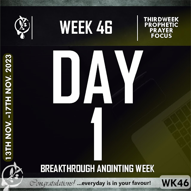 FRESH OIL MONDAY 13TH NOV -17TH NOV. 2023. PROPHETIC PRAYER FOCUS: I AM IN MY BREAKTHROUGH ANOINTING WEEK ALREADY! THE BOUNDS OF THE WICKED ARE BROKEN! I CALL FORTH MY 11TH HOUR MIRACLES IN ALL RAMIFICATIONS!!! (IT’S MY SEASON OF ALL-ROUND POSSIBILITY, PRODUCTIVITY AND PROSPERITY).