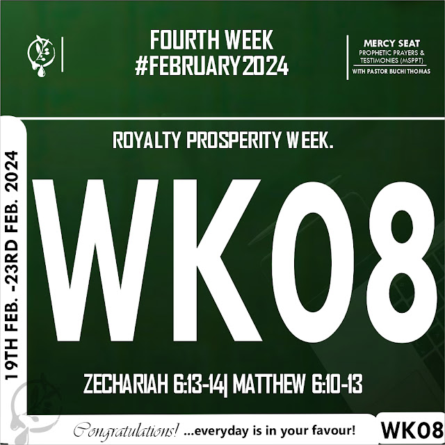 MERCY SEAT PRAYERS 19TH FEB-23RD FEB. 2024. PROPHETIC PRAYER FOCUS: I AM IN MY ROYALTY PROSPERITY WEEK ALREADY!!! I AM GOD’S KINGDOM CELEBRITY THROUGH JESUS CHRIST TO MY WORLD! I LIGHT UP MY WORLD BY THE POWER OF THE HOLY GHOST! (IT’S MY SEASON OF MORE POSSIBILITY, MORE PRODUCTIVITY AND MORE PROSPERITY).