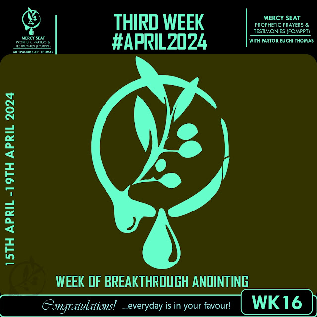 MERCY SEAT PRAYERS 15TH APRIL-19TH APRIL. 2024 PROPHETIC PRAYER FOCUS: I AM IN MY BREAKTHROUGH ANOINTING WEEK ALREADY. I DECLARE NOW, MY RESURRECTION, TRANSFORMATION, SUPERNATURAL LIFTING. I ACTIVATE NOW MY THREE-FOLD MORE BLESSINGS AND TESTIMONIES (IT’S MY SEASON OF MORE POSSIBILITY, MORE PRODUCTIVITY AND MORE PROSPERITY).