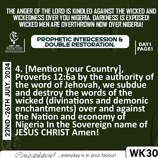 MERCY SEAT PRAYERS 22ND JULY -25TH JULY. 2024. PROPHETIC PRAYER FOCUS: I AM IN MY PROPHETIC INTERCESSION AND DOUBLE RESTORATION WEEK ALREADY. PROPHETIC PRAYER DECLARATION: I STEP UP TO MY CHRIST ORDAINED HIGHER GROUND THIS SEASON. I ACTIVATE HIGH FAVOURS IN MY ENDAVOUR (IT’S MY SEASON OF MORE POSSIBILITY, MORE PRODUCTIVITY AND MORE PROSPERITY).
