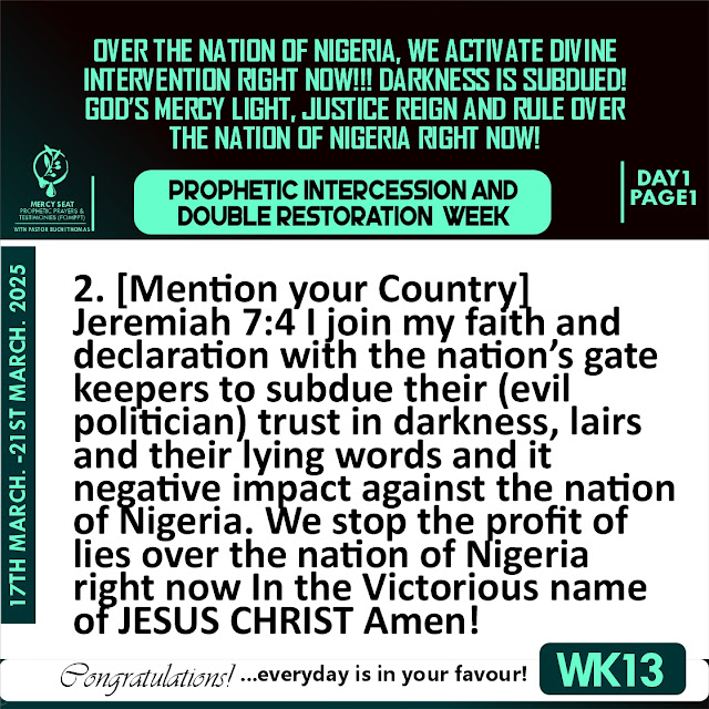 MERCY SEAT PRAYERS 24TH MARCH 2025 28TH MARCH 2025. PROPHETIC PRAYER FOCUS: I AM IN MY PROPHETIC INTERCESSION AND DOUBLE RESTORATION WEEK ALREADY!!! I ACTIVATE MY SEASON OF HIGH FAVOURS, HIGH FORTUNES, GREATER TESTIMONIES (IT’S MY SEASON OF GREATER POSSIBILITY, GREATER PRODUCTIVITY AND GREATER PROSPERITY).